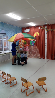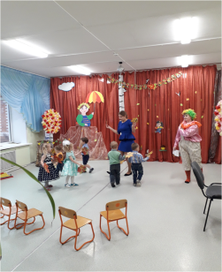 5 ноября у детей младшей разновозрастной группы состоялся утренник «Осень в золотой косынке». На празднике для детей была создана радостная атмосфера, все дети получили положительный настрой, встретились с такими персонажами, как «Тучка» и «Осень», а также приняли активное участие в подвижных играх, водили хороводы.