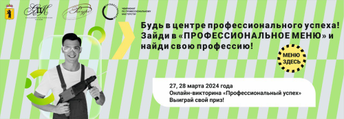 С 21.03.2024 для вас будет открыт сайт «Профессионалы 2024» https://professionals.resurs-yar.ru/, в разделе сайта «Профессиональное меню» вы сможете познакомиться с 65 наиболее актуальными, востребованными и перспективными профессиональными компетенциями из 12 профессиональных сфер. Каждый день в период с 22-31.032024 на сайте будут размещаться красочные видеоролики по каждой из компетенций, посмотрев которые, вы сможете узнать полезную информацию напрямую с площадок и оценить привлекательность видео «лайком».